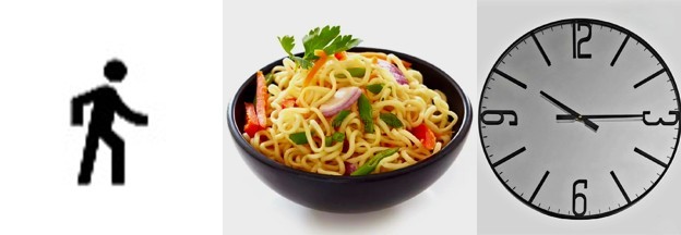 Au premier degré, ces trois images sont une façon de souhaiter Santé (l’homme qui marche), Plaisir (le bol de nouilles) et Longue vie (l’horloge).