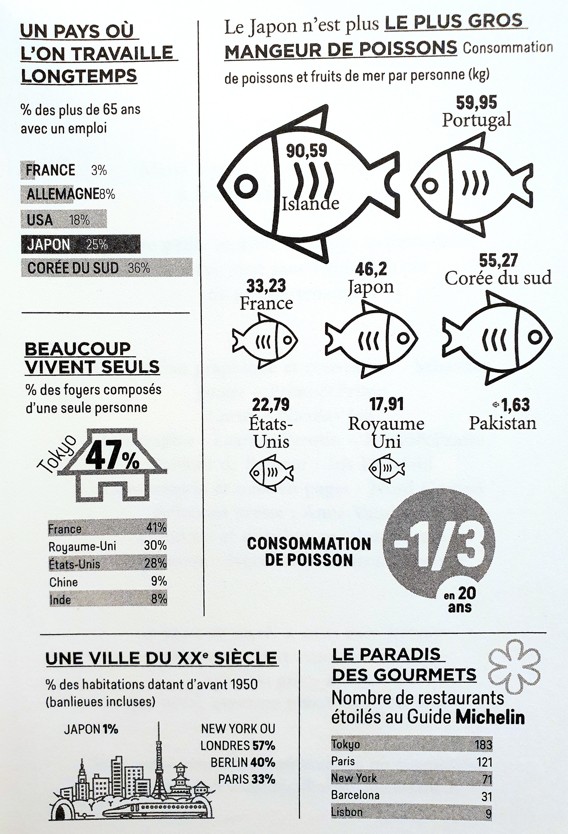 C’est amusant, la France se situe juste derrière le Japon concernant la consommation de poisson et de mangas par habitant, le pourcentage de célibataires, et le nombre de restaurants étoilés.