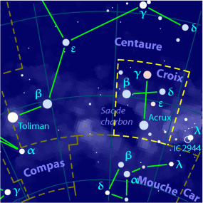 La Croix du Sud est une petite constellation de l’hémisphère sud, entre la Mouche et le Centaure ; elle contient un amas d’étoiles appelé « la Boîte à bijoux ».