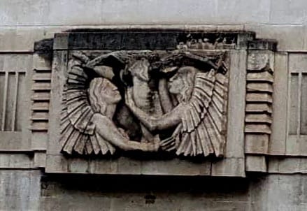 Au fronton de l’immeuble imposant qui suit, apercevons-nous les anges adorateurs des triomphes priapiques ou des Amérindiens sur le chemin de l’amour, assurant la maintenance d’un totem ?