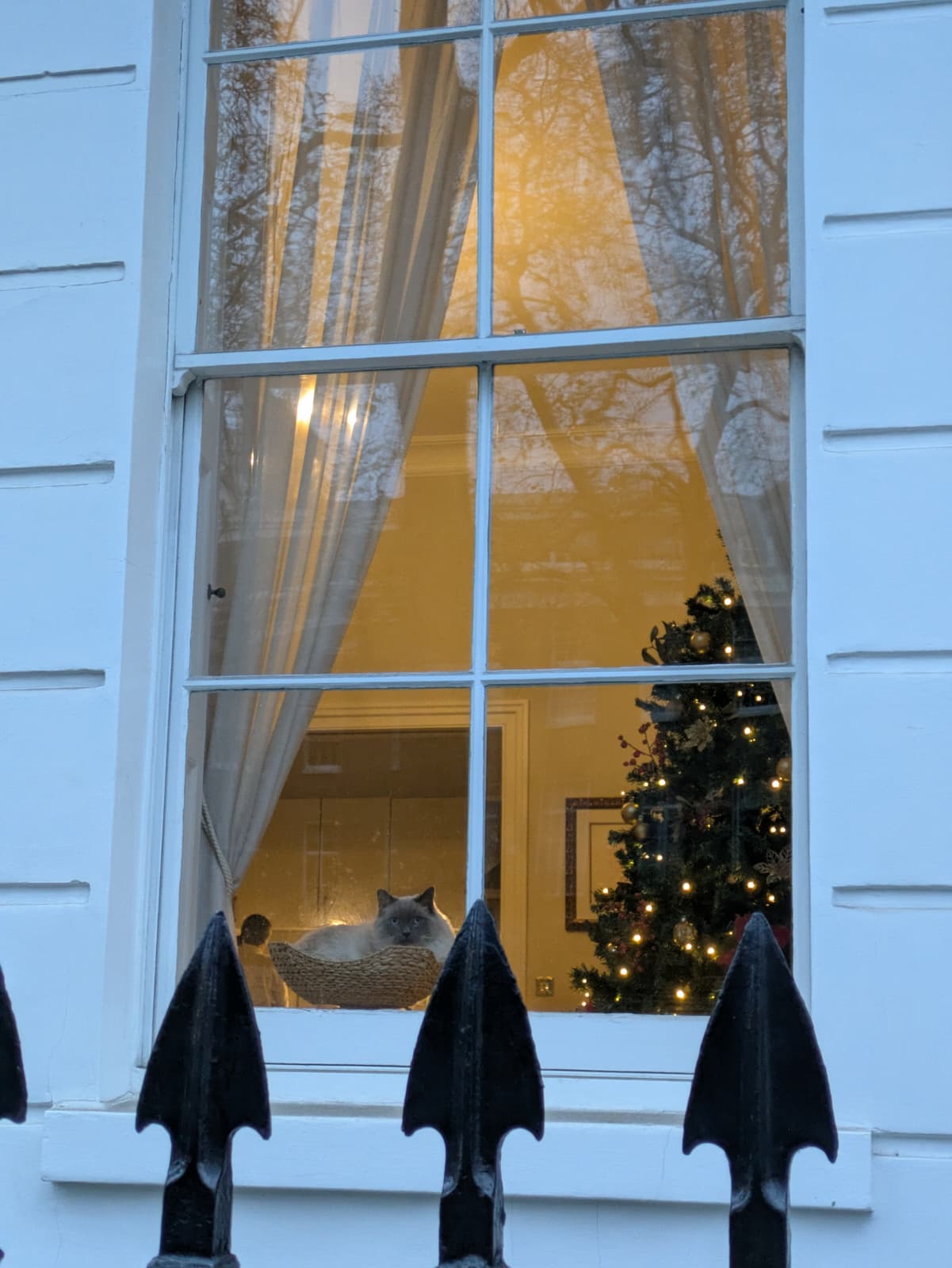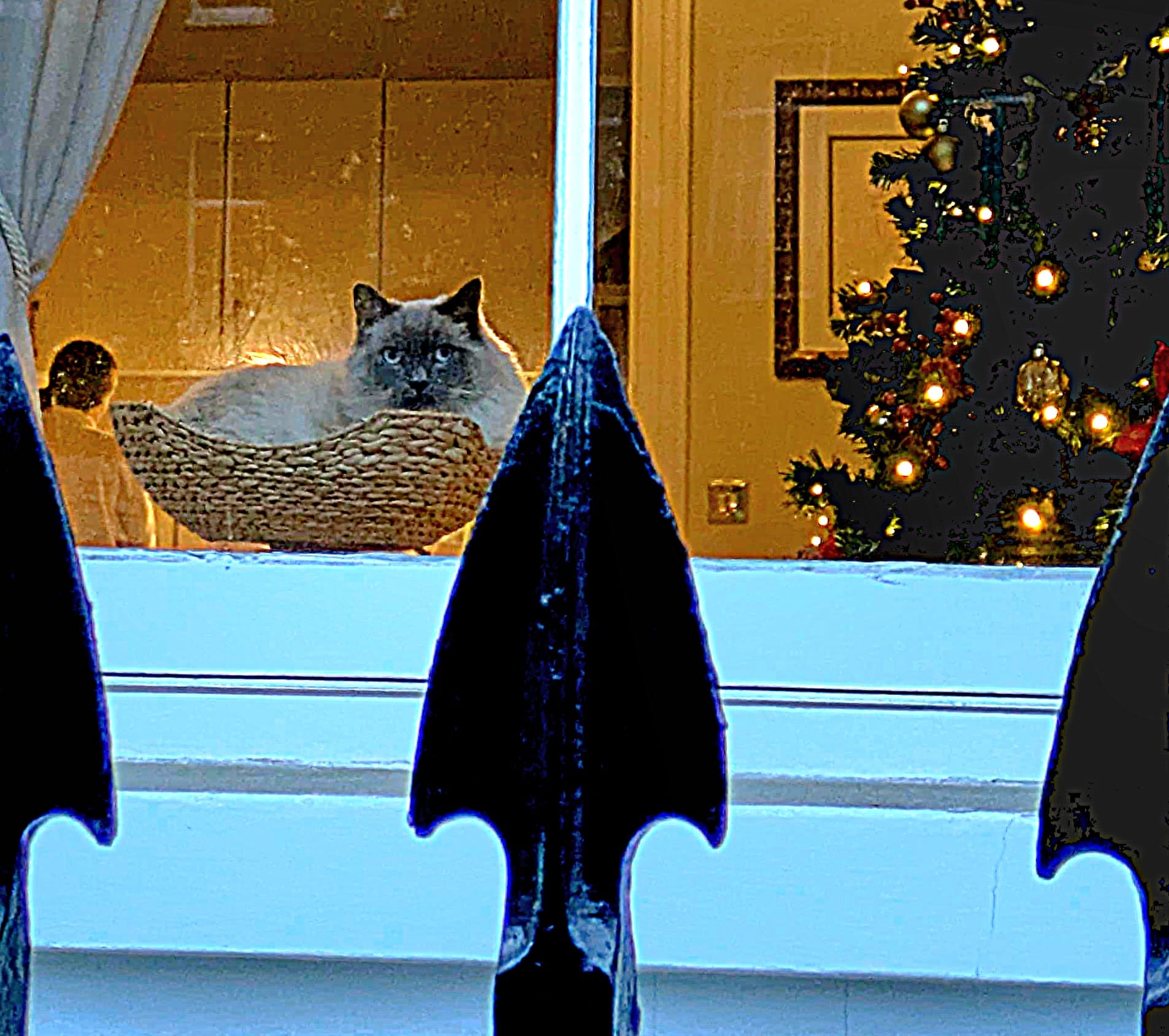 Bien au chaud dans sa corbeille en osier du Gué Droit, le chat sacré de Birmanie n’est pas concerné. Sapin monumental, hauteur sous plafond difficile à chauffer. Mais la température semble convenir au signe extérieur de richesse qui vous observe derrière la vitre.