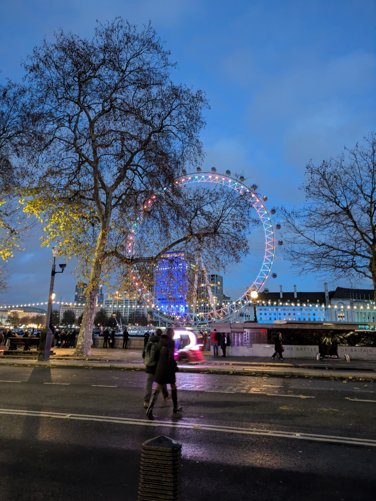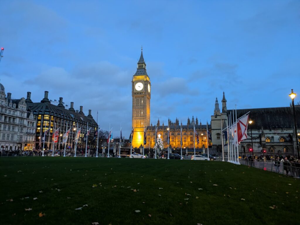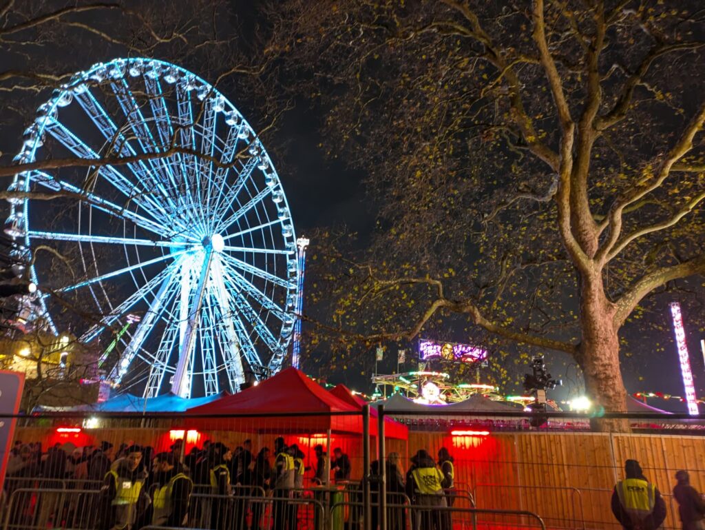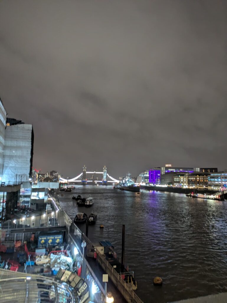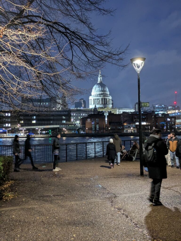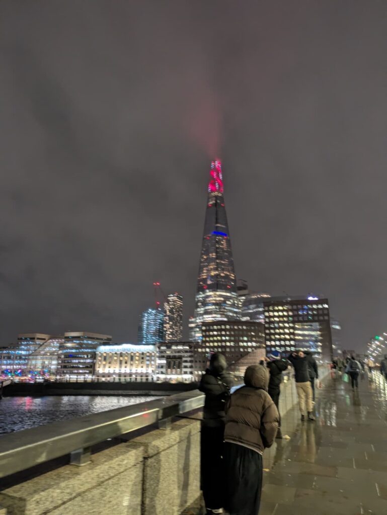 Un ciel blanc et chargé comme on les aime, idéal pour magnifier l’éclat des enluminures dans la nuit londonienne.