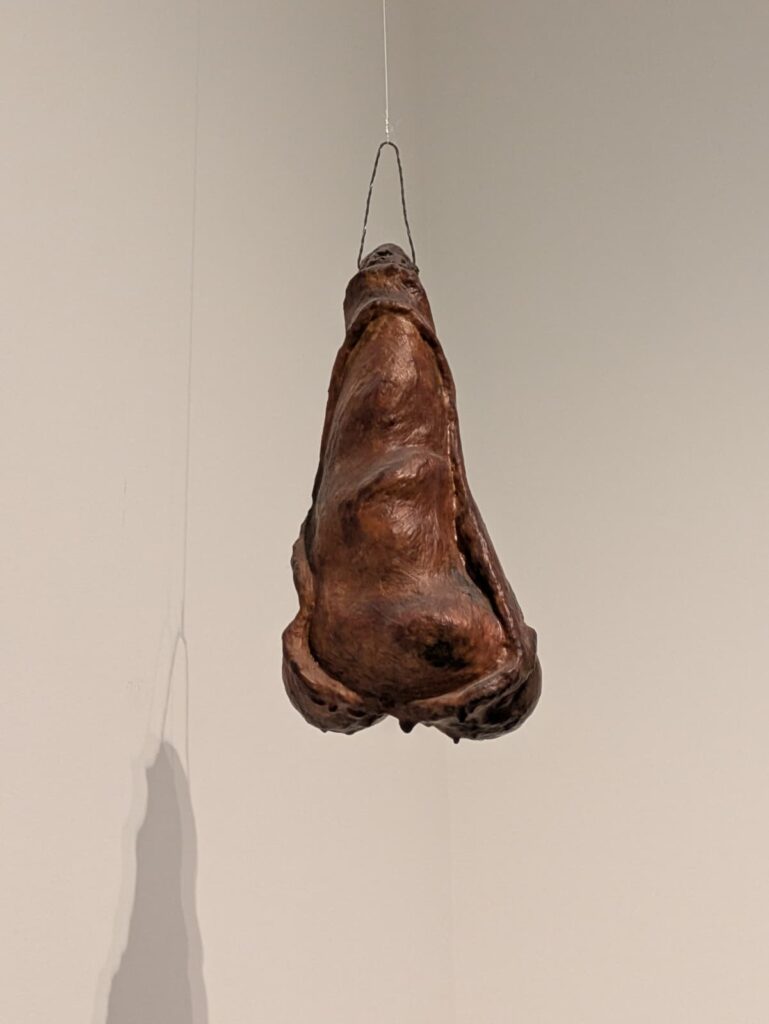 Latex, plâtre, fil de fer et peinture. Cette sculpture représente un phallus agrandi, réalisé par superposition de latex sur du plâtre pour créer une texture charnue et tactile.