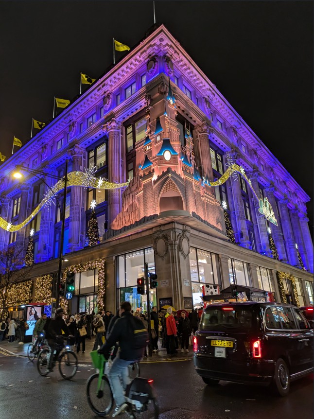 L’extérieur du magasin d’Oxford Street (image ci-avant) est affublé d’un faux nez en forme de donjon et un spectacle lumineux met en scène, au son des hautbois, le château de la Belle au Bois Dormant de Disneyland Paris (attention, le bel hautbois d’or ment).