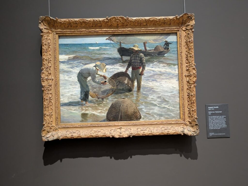 Sur une plage ensoleillée près de Valence, deux hommes inspectent leurs nasses en osier tandis qu’un bateau de pêche accoste. Sorolla est devenu célèbre pour ses scènes de plage méditerranéennes baignées de lumière. Cette toile figure parmi ses premières œuvres sur ce thème. Il y saisit la lumière vive du soleil et les ombres bleutées se reflétant sur l’eau qui caresse le sable dont les grains s’incrustent sous les ongles des pêcheurs pour former des panaris multicolores.