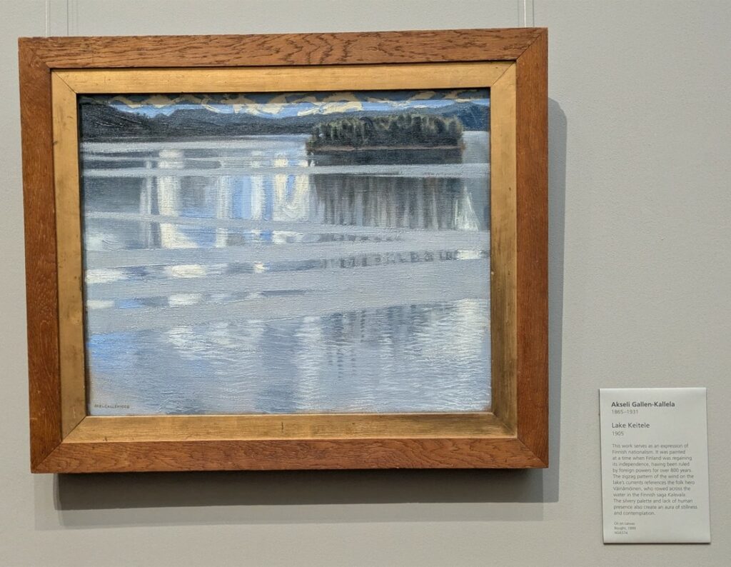L’esprit colonialiste, la lumière méditerranéenne, les personnages en pleine activité et le bouillonnement des eaux de la marine de Sorolla, s’opposent à l’émancipation, la lumière argentée, l’absence de personnage et la vibration du vent à la surface des eaux lacustres du tableau d’Akseli Gallen-Kallela, ci-dessous.